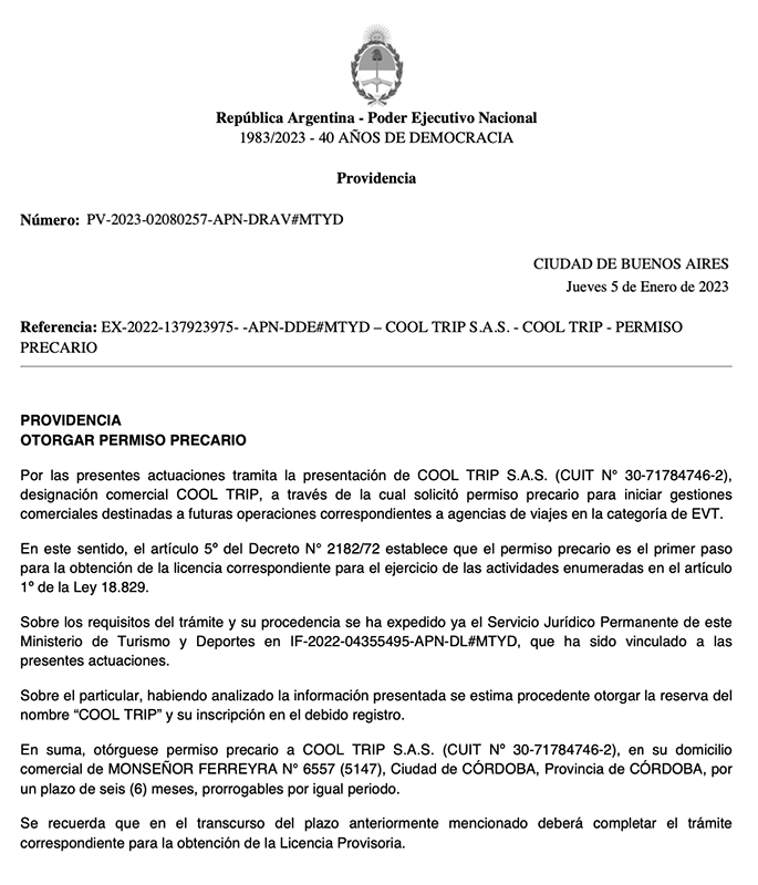 De acuerdo con lo establecido en la resolución Resolución N° 366/22 del Ministerio de Turismo y Deportes se exhibe documentación correspondiente para operar con local virtual.